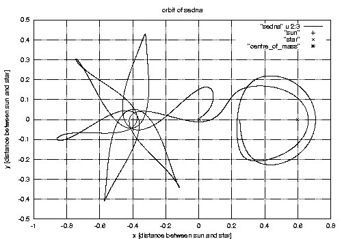 ![]() The captured orbit of Sedna after an encounter with a 4/6 solar-mass star on a weakly hyperbolic orbit. |