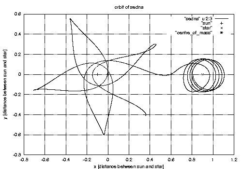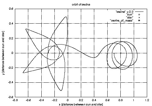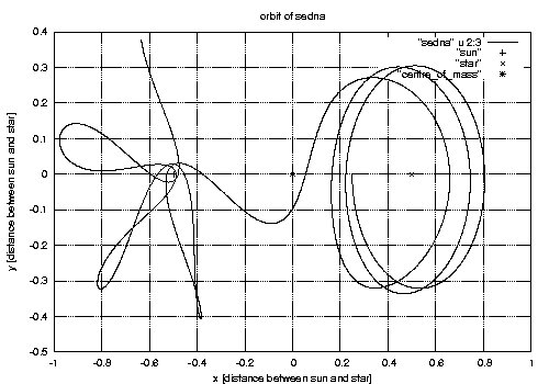 ![]() The captured orbit of Sedna after an encounter with a 2/8 solar-mass star on a weakly hyperbolic orbit. |