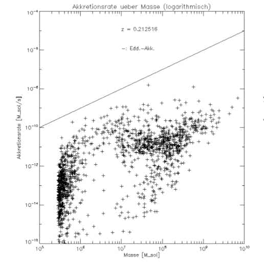 In this bachelor thesis the evolution of black holes in the centre of galaxies was investigated especially concerning the temporal development of their accretion rates and their masses for different redshift intervals between z=6.8 and z=0.0 depending on the used simulation. It managed to point out a characteristic evolution of the black holes by the consideration of simulated findings. In order to test the conclusions drawn by analysing simulated findings, comparisons of observational and simulated data concerning the accretion rates and masses as well as concerning the luminosity function were done.