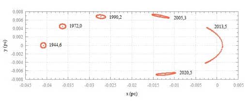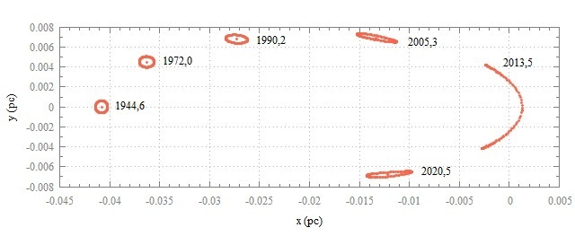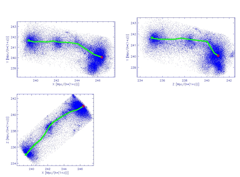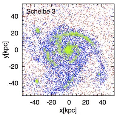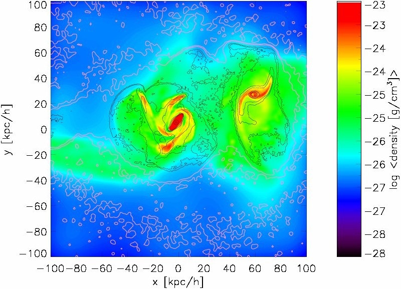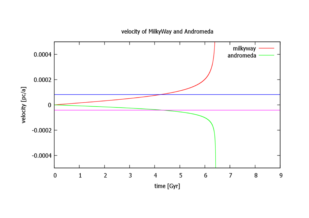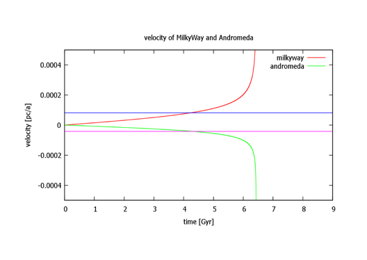 In my bachelor thesis I should calculate the time of the possible collision between the Milky Way and the Andromeda-Galaxy. Therefore I created a program using Fortran, that computed the velocity and the position of the two big galaxys only under the influence of the gravitation force between them. I used the Leapfrog-method, which is more exact than the Euler algorithm, because it calculates position and velocity at different time-steps. The result was that the possible merger of Milky Way and Andromeda starts in 2 - 3 billion years. In the picture you can see the time until the two galaxies begin zu merge. The red line is the velocity of Milky Way and the green one that of Andromeda. The two horizontal lines represent the actual difference of the velocities of Milky Way and Andromeda. So the collision takes place in about 2 Gyr.