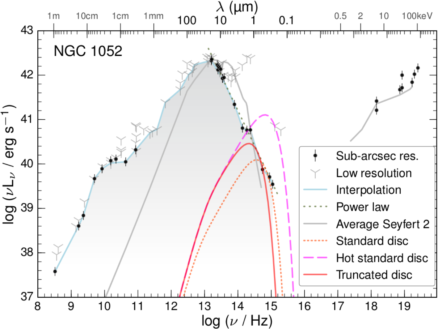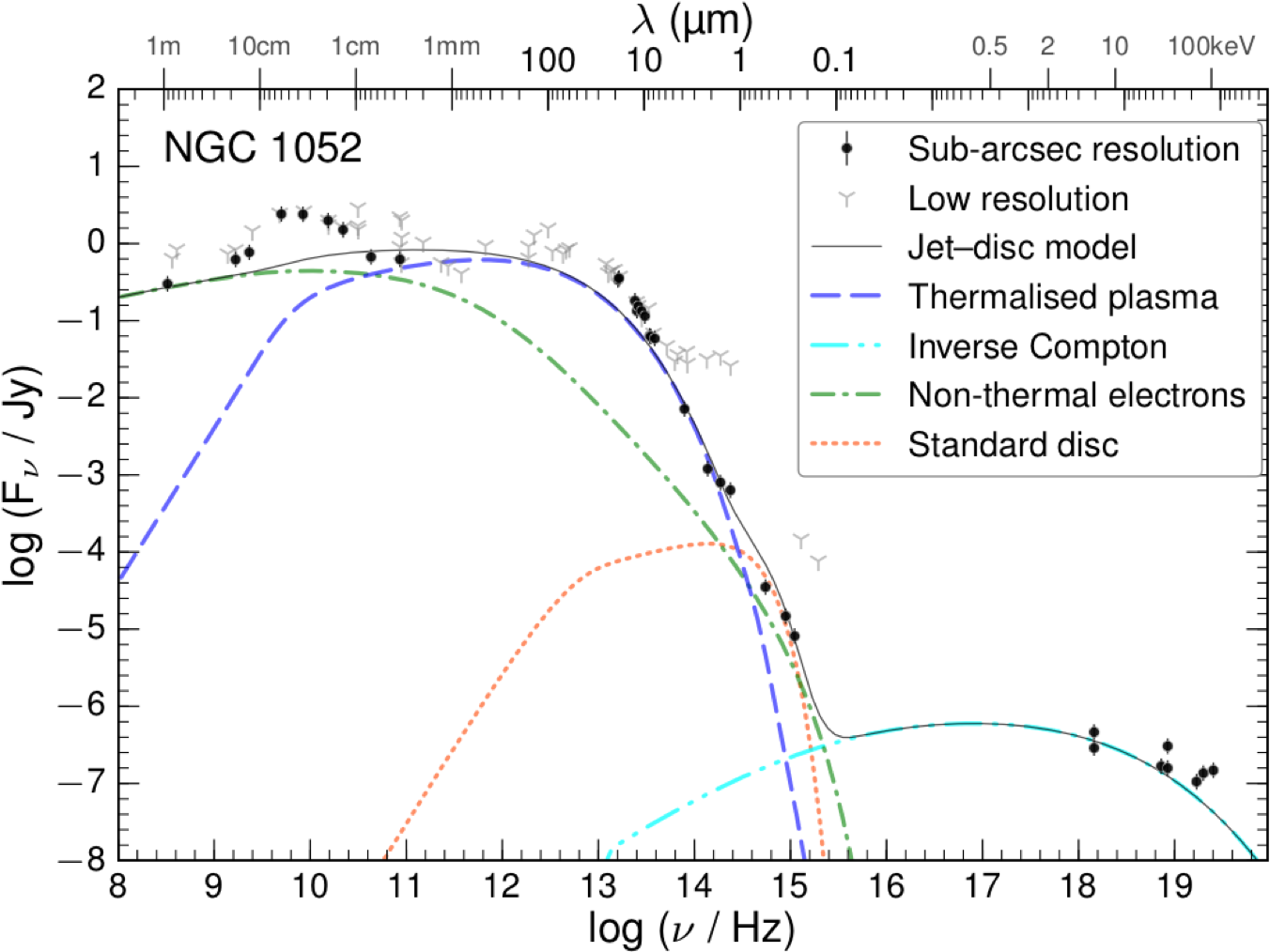 The high-angular resolution data allow us to infer the continuum emission within ~17 pc around the black hole to be not dominated by thermal emission from dust in a torus (grey line, lower plot) as measured in Seyfert 2 AGNs. Instead, the compact jet–disc model representation (black thin line, upper plot) captures the prominent features of the continuum emission.
