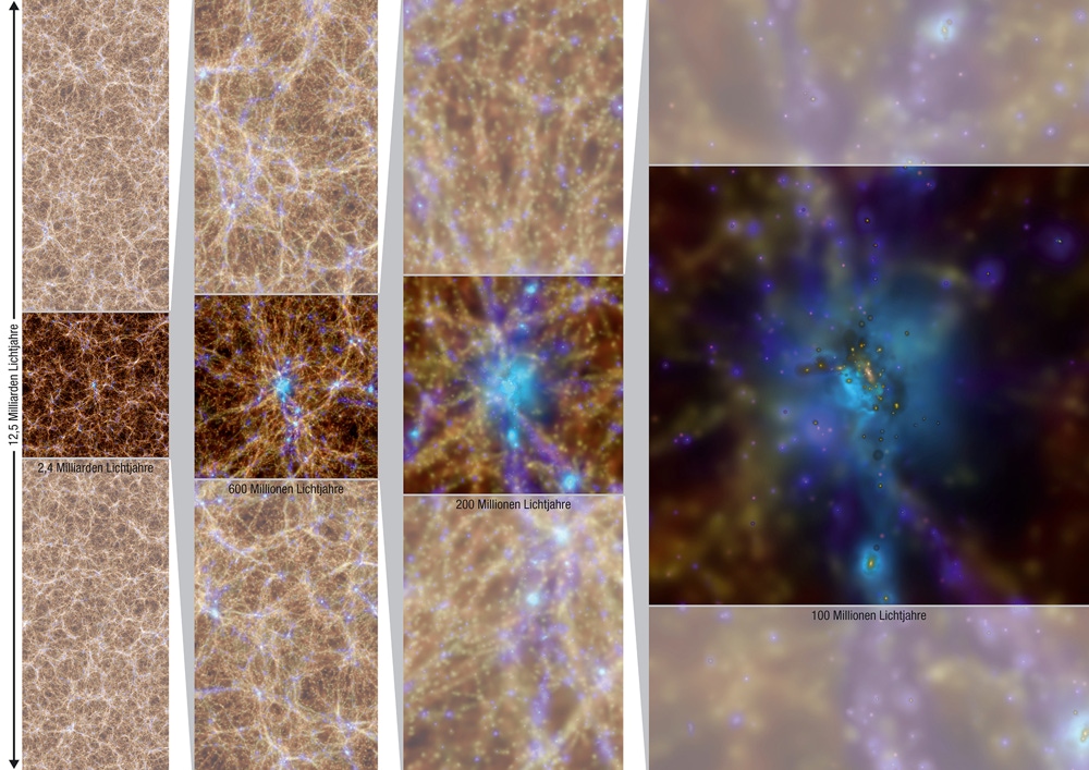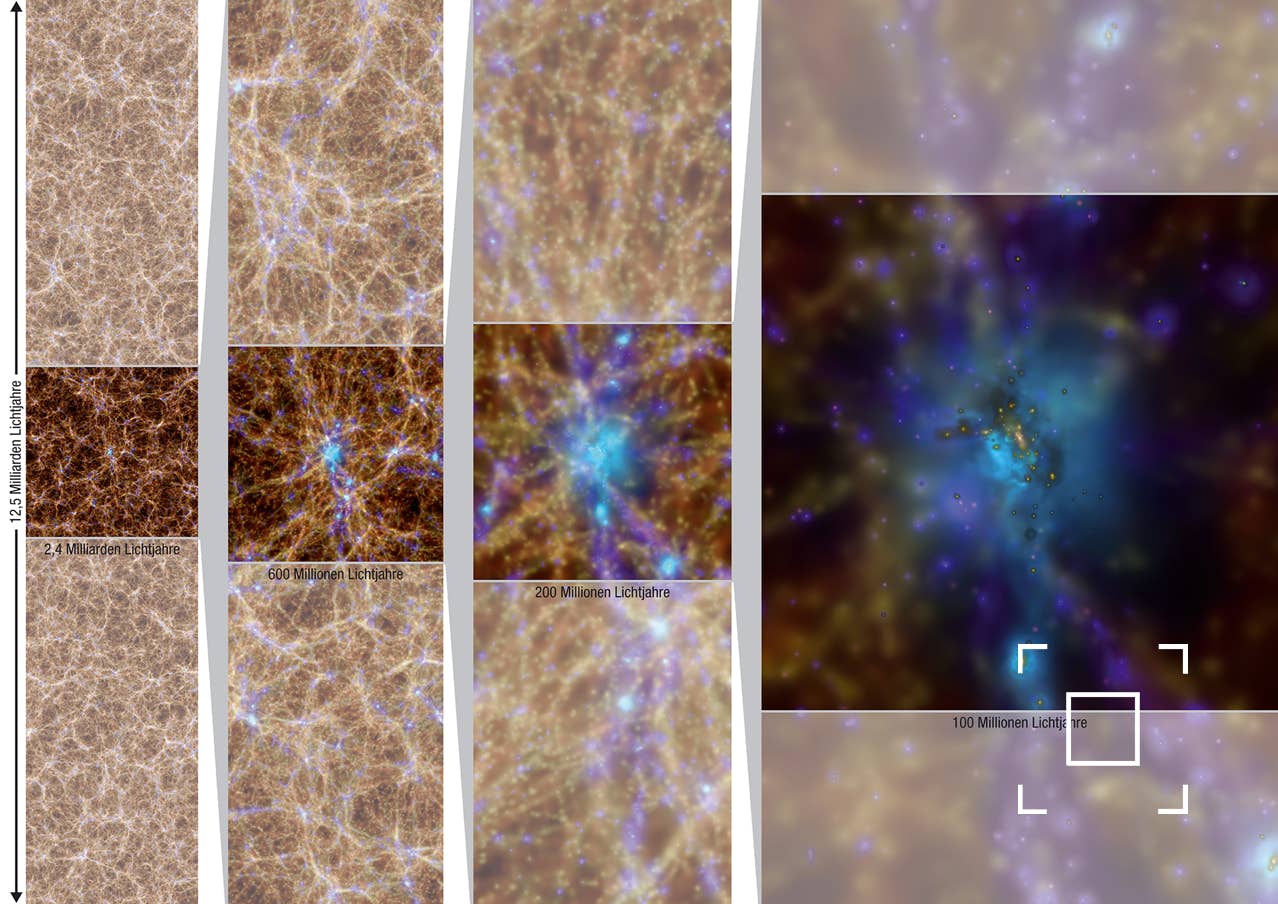 The most comprehensive simulation (shown in the zoom-in image) covers the spatial area of a cube with a box size of 12.5 billion light years. Such a tremendously large section of the universe was never simulated before. It was divided into a previously unattained number of 180 billion resolution elements, each representing the detailed properties of the universe and containing about 500 bytes of information.
