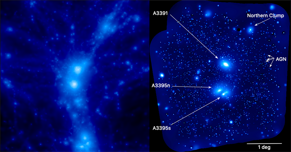Image showing the distribution of hot gas in the output of the Magneticum simulation (left) compared with the eROSITA X-ray image of the Abell 3391/95 system (right); (c) Reiprich et al., Astronomy & Astrophysics, DOI: 10.1051/0004-6361/202039590