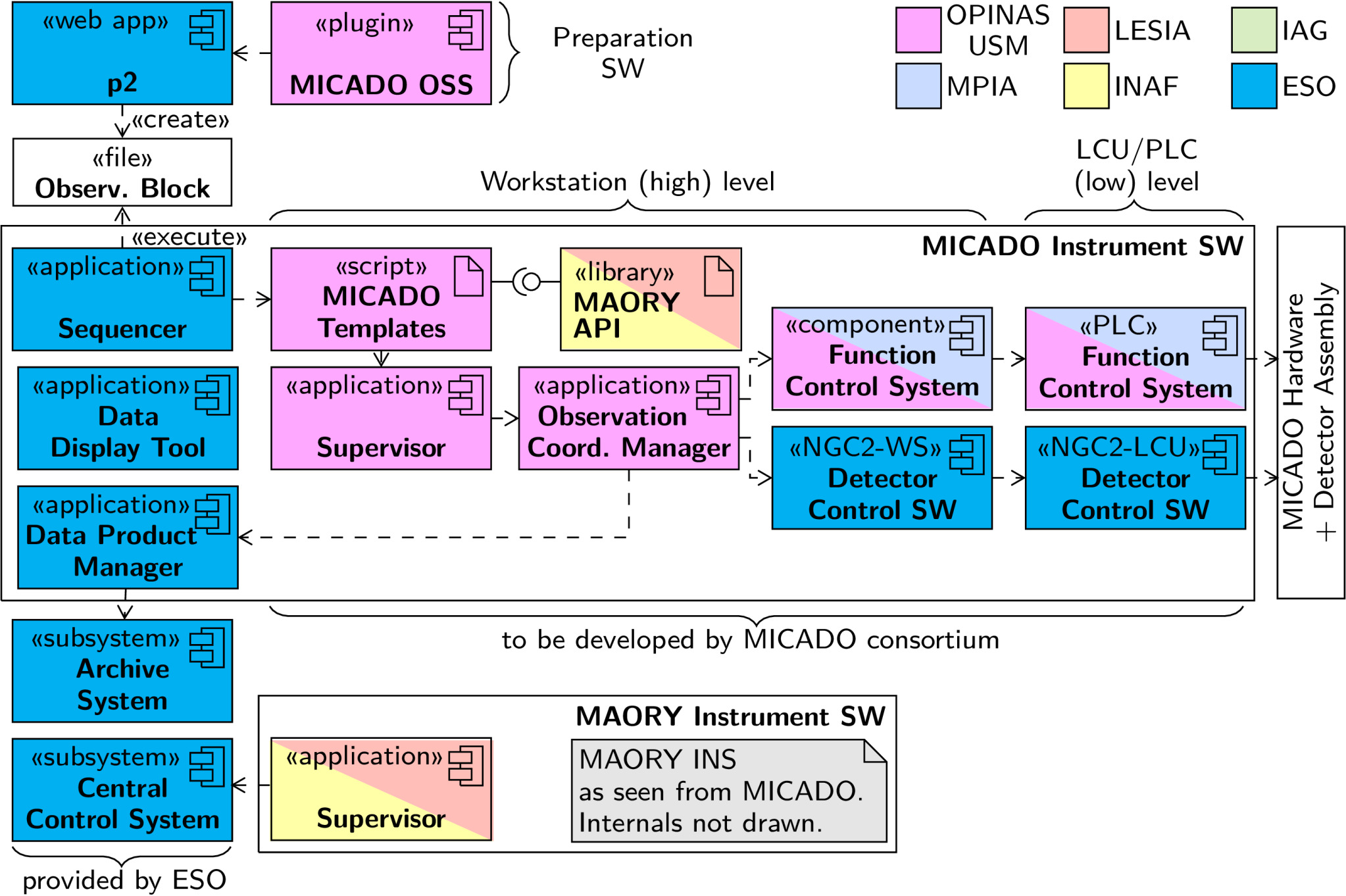 The Micado Instrument Control SoftwareThe MICADO control software is responsible for the coordination of all actions necessary for an observation with the MICADO instrument; in addition, the preparation of observations is regarded as part of this software package, too. The overall layout of the control software is shown in the Figure. The control software can be roughly divided into the following components:a) Observation Coordination System (OCS) This is the highest layer in the software, being responsible for the synchronization of all sub-systems during an observation and for interfacing all external actors (as the ELT or the AO). The implementation of the OCS will be based on a software framework delivered by ESO, using C++ for its business logic, Qt for graphical user interfaces, and Python for all scripting purposes. b) Function Control System (FCS) This part of the software is responsible for the interaction with the various hardware devices in MICADO (motors, lamps, switches, and so on). It will be implemented in a two-layer fashion: c) Observer Support Software (OSS) This part of software will be used in combination with ESO standard tools by any astronomer preparing an observation with MICADO. It aims at simplifying and optimizing instrument-specific tasks as the selection of suitable natural guide stars for the AO system and the definition of an offset/dither pattern, and it shall provide a visual representation of the preparation settings along with both graphical and scripting interfaces. Currently a Python/C++-based prototype is being developed as a stand-alone application (see for more details). Its functionality will later be integrated as a plugin into ESO's p2 web application, implementing the MICADO-specific tasks as independent web services.